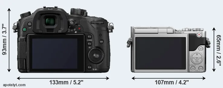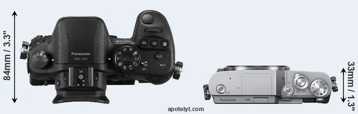 The side-by-side display below illustrates the physical size and weight of the Panasonic GH4 and the Panasonic GX800. The two cameras are presented according to their relative size. Three successive views from the front, the top, and the rear are shown. All size dimensions are rounded to the nearest millimeter.