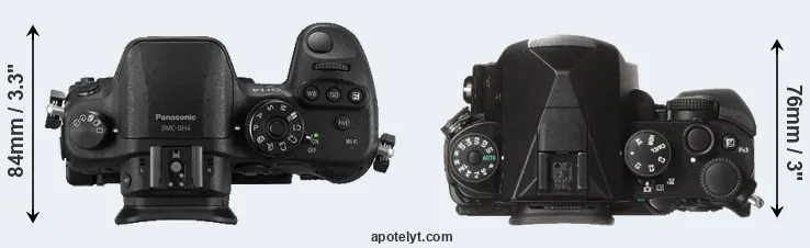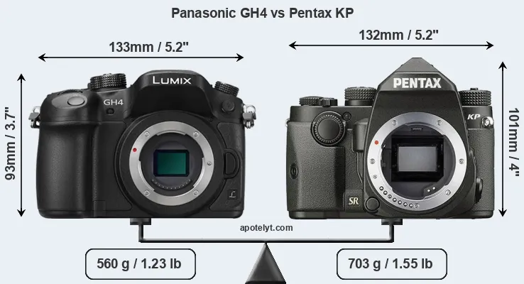 The physical size and weight of the Panasonic GH4 and the Pentax KP are illustrated in the side-by-side display below. The two cameras are presented according to their relative size. Three consecutive views from the front, the top, and the rear side are shown. All width, height and depth measures are rounded to the nearest millimeter.