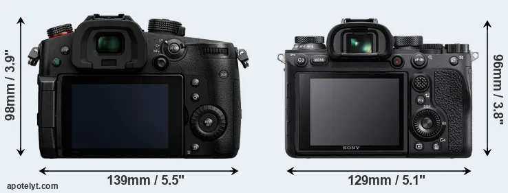 The physical size and weight of the Panasonic GH5 II and the Sony A9 II are illustrated in the side-by-side display below. The two cameras are presented according to their relative size. Three successive views from the front, the top, and the rear are shown. All width, height and depth dimensions are rounded to the nearest millimeter.