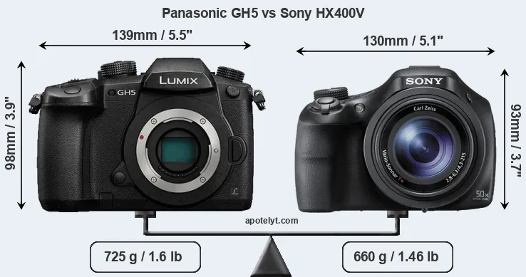 An illustration of the physical size and weight of the Panasonic GH5 and the Sony HX400V is provided in the side-by-side display below. The two cameras are presented according to their relative size. Three successive views from the front, the top, and the rear are shown. All size dimensions are rounded to the nearest millimeter.