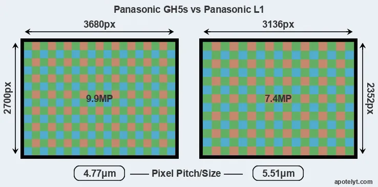 While the two cameras under review share the same sensor size, the GH5s offers a higher resolution of 9.9 megapixels, compared with 7.4 MP of the L1. This megapixels advantage translates into a 17 percent gain in linear resolution. On the other hand, these sensor specs imply that the GH5s has a higher pixel density and a smaller size of the individual pixel (with a pixel pitch of 4.77μm versus 5.51μm for the L1). In this context, it should be noted, however, that the GH5s is much more recent (by 11 years and 10 months) than the L1, and its sensor will have benefitted from technological advances during this time that compensate for the smaller pixel size. Coming back to sensor resolution, it should be mentioned that the GH5s has no anti-alias filter installed, so that it can capture all the detail its sensor resolves.