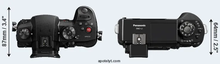 An illustration of the physical size and weight of the Panasonic GH5s and the Panasonic L1 is provided in the side-by-side display below. The two cameras are presented according to their relative size. Three consecutive perspectives from the front, the top, and the back are available. All size dimensions are rounded to the nearest millimeter.