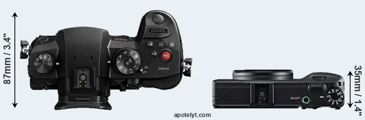 The side-by-side display below illustrates the physical size and weight of the Panasonic GH5s and the Ricoh GR. The two cameras are presented according to their relative size. Three successive views from the front, the top, and the rear are shown. All width, height and depth measures are rounded to the nearest millimeter.