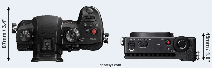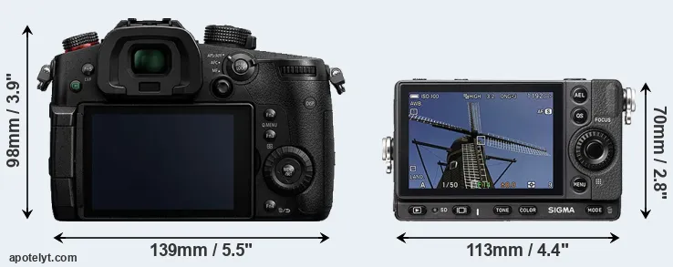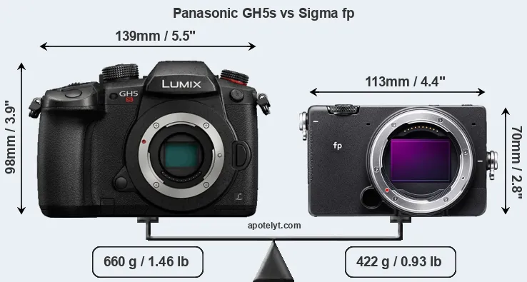 The side-by-side display below illustrates the physical size and weight of the Panasonic GH5s and the Sigma fp. The two cameras are presented according to their relative size. Three consecutive perspectives from the front, the top, and the back are available. All width, height and depth measures are rounded to the nearest millimeter.