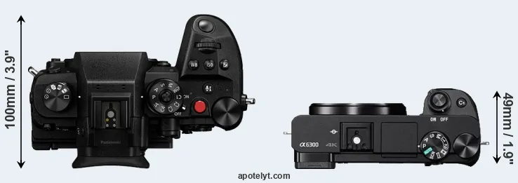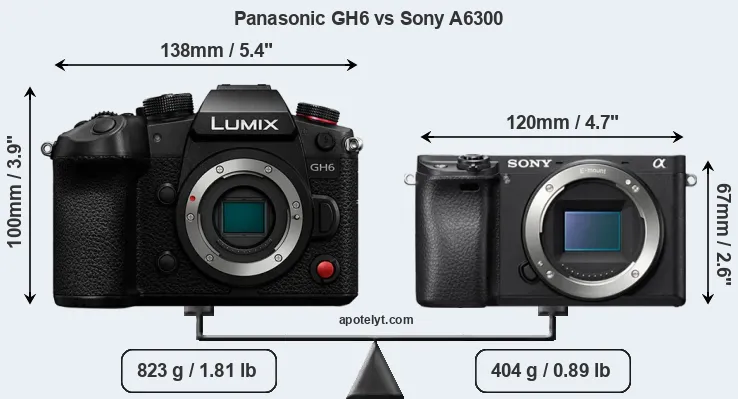 The physical size and weight of the Panasonic GH6 and the Sony A6300 are illustrated in the side-by-side display below. The two cameras are presented according to their relative size. Three consecutive views from the front, the top, and the rear side are shown. All width, height and depth measures are rounded to the nearest millimeter.