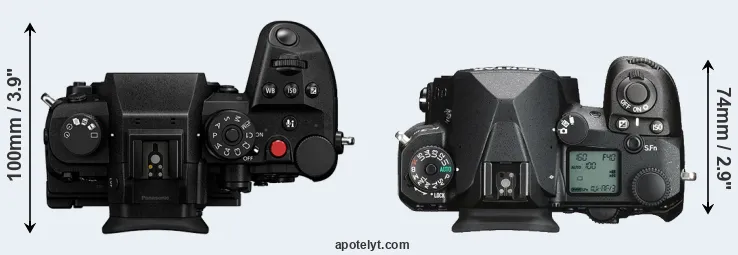 The physical size and weight of the Panasonic GH7 and the Pentax K-3 III are illustrated in the side-by-side display below. The two cameras are presented according to their relative size. Three consecutive views from the front, the top, and the rear side are shown. All width, height and depth measures are rounded to the nearest millimeter.
