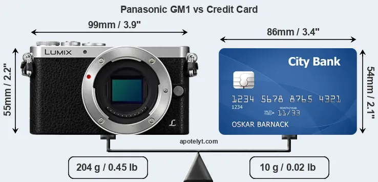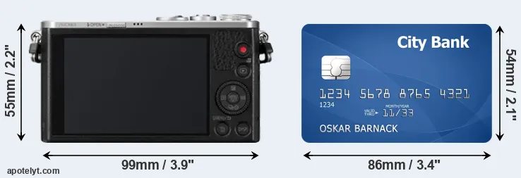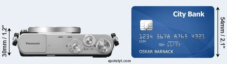 An illustration of the physical dimensions of the Panasonic GM1 vis-à-vis a credit card is provided in the side-by-side display below. Three consecutive views from the front, the top, and the rear side are shown. All width, height and depth measures are rounded to the nearest millimeter.