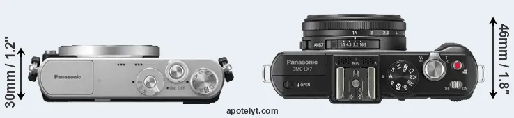The Panasonic Lumix DMC-GM1 and the Panasonic Lumix DMC-LX7 are two digital cameras that were announced, respectively, in October 2013 and July 2012. The GM1 is a mirrorless interchangeable lens camera, while the LX7 is a fixed lens compact. The cameras are based on a Four Thirds (GM1) and a 1/1.7-inch (LX7) sensor. The GM1 has a resolution of 15.8 megapixels, whereas the LX7 provides 10 MP.