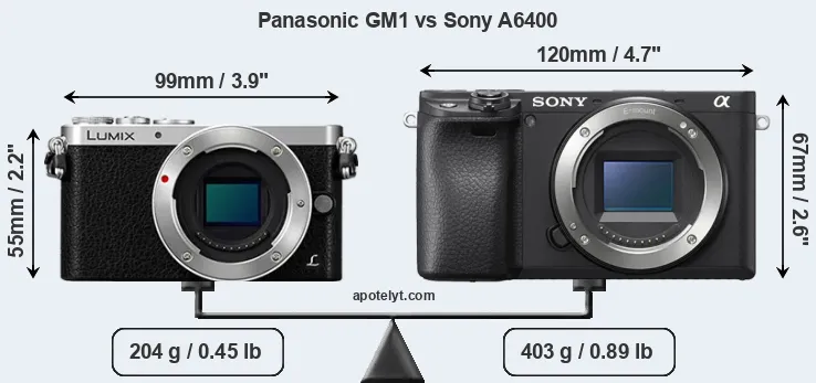 If the front view area (width x height) of the cameras is taken as an aggregate measure of their size, the Sony A6400 is considerably larger (48 percent) than the Panasonic GM1. Moreover, the A6400 is substantially heavier (98 percent) than the GM1. It is noteworthy in this context that the A6400 is splash and dust-proof, while the GM1 does not feature any corresponding weather-sealing.