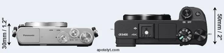 The side-by-side display below illustrates the physical size and weight of the Panasonic GM1 and the Sony A6400. The two cameras are presented according to their relative size. Three consecutive views from the front, the top, and the rear side are shown. All width, height and depth dimensions are rounded to the nearest millimeter.