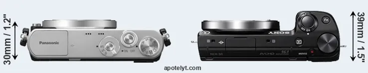 The physical size and weight of the Panasonic GM1 and the Sony NEX-5R are illustrated in the side-by-side display below. The two cameras are presented according to their relative size. Three consecutive perspectives from the front, the top, and the back are available. All width, height and depth measures are rounded to the nearest millimeter.