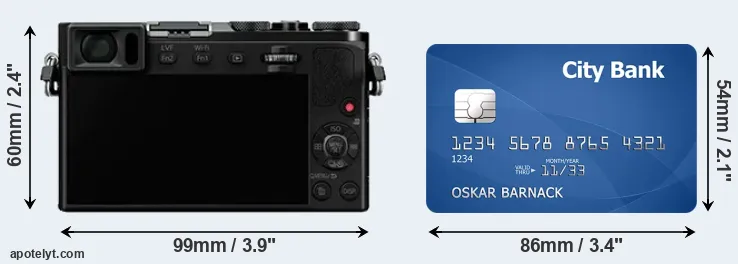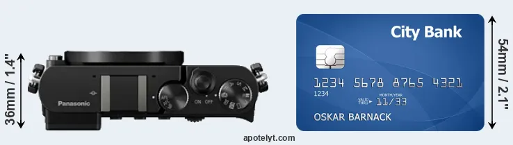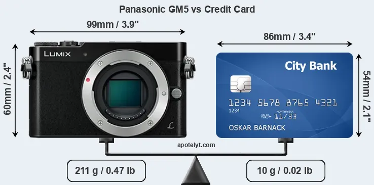 An illustration of the physical dimensions of the Panasonic GM5 vis-à-vis a credit card is provided in the side-by-side display below. Three consecutive perspectives from the front, the top, and the back are presented. All size dimensions are rounded to the nearest millimeter.