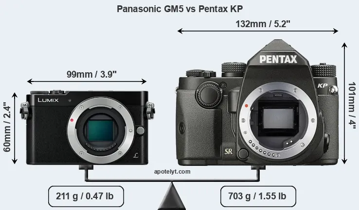 If the front view area (width x height) of the cameras is taken as an aggregate measure of their size, the Pentax KP is considerably larger (124 percent) than the Panasonic GM5. Moreover, the KP is substantially heavier (233 percent) than the GM5. It is noteworthy in this context that the KP is splash and dust-proof, while the GM5 does not feature any corresponding weather-sealing.