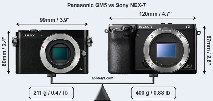 If the front view area (width x height) of the cameras is taken as an aggregate measure of their size, the Sony NEX-7 is notably larger (35 percent) than the Panasonic GM5. Moreover, the NEX-7 is substantially heavier (90 percent) than the GM5. In this context, it is worth noting that neither the GM5 nor the NEX-7 are weather-sealed.
