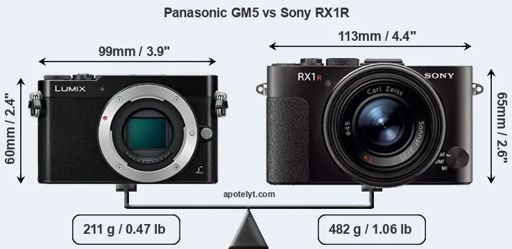 The above size and weight comparisons are to some extent incomplete and possibly misleading, as the RX1R has a lens built in, whereas the GM5 is an interchangeable lens camera that requires a separate lens. Attaching the latter will add extra weight and bulk to the setup. You can compare the optics available for the GM5 and their specifications in the Micro Four Thirds Lens Catalog.
