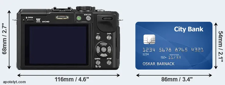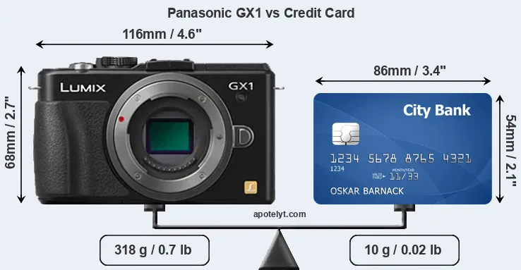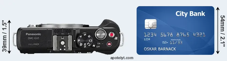 The physical dimensions of the Panasonic GX1 relative to a credit card are illustrated in the side-by-side display below. Three consecutive views from the front, the top, and the rear side are shown. All size dimensions are rounded to the nearest millimeter.