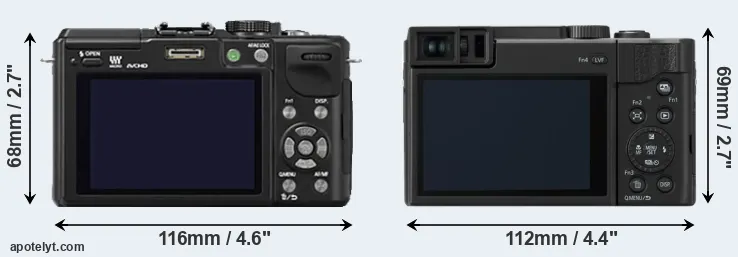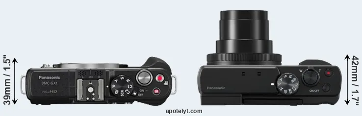 The side-by-side display below illustrates the physical size and weight of the Panasonic GX1 and the Panasonic TZ95. The two cameras are presented according to their relative size. Three consecutive views from the front, the top, and the rear side are shown. All width, height and depth dimensions are rounded to the nearest millimeter.