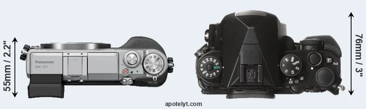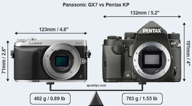 The physical size and weight of the Panasonic GX7 and the Pentax KP are illustrated in the side-by-side display below. The two cameras are presented according to their relative size. Three successive views from the front, the top, and the rear are shown. All width, height and depth dimensions are rounded to the nearest millimeter.