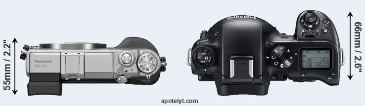 The side-by-side display below illustrates the physical size and weight of the Panasonic GX7 and the Samsung NX1. The two cameras are presented according to their relative size. Three consecutive perspectives from the front, the top, and the back are available. All width, height and depth measures are rounded to the nearest millimeter.