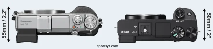 The side-by-side display below illustrates the physical size and weight of the Panasonic GX7 and the Sony A6400. The two cameras are presented according to their relative size. Three successive views from the front, the top, and the rear are shown. All size dimensions are rounded to the nearest millimeter.