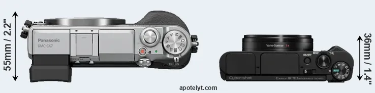 The physical size and weight of the Panasonic GX7 and the Sony HX95 are illustrated in the side-by-side display below. The two cameras are presented according to their relative size. Three successive views from the front, the top, and the rear are shown. All width, height and depth measures are rounded to the nearest millimeter.