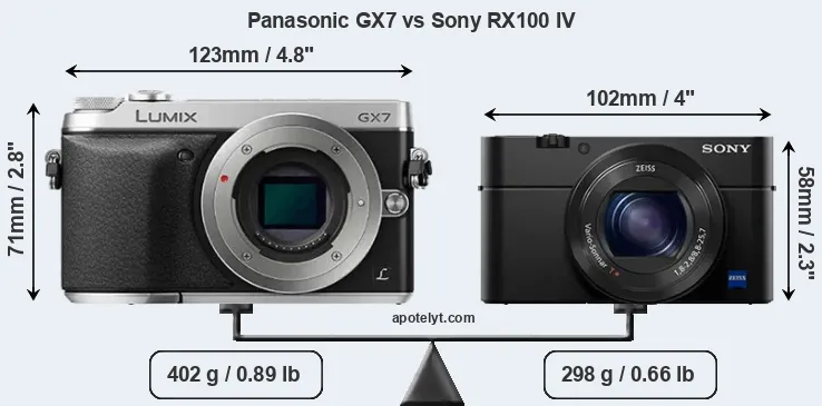 An illustration of the physical size and weight of the Panasonic GX7 and the Sony RX100 IV is provided in the side-by-side display below. The two cameras are presented according to their relative size. Three successive views from the front, the top, and the rear are shown. All width, height and depth measures are rounded to the nearest millimeter.