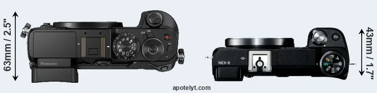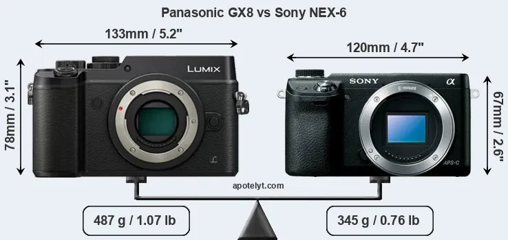 The physical size and weight of the Panasonic GX8 and the Sony NEX-6 are illustrated in the side-by-side display below. The two cameras are presented according to their relative size. Three consecutive perspectives from the front, the top, and the back are available. All width, height and depth dimensions are rounded to the nearest millimeter.