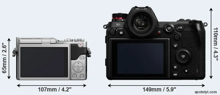 If the front view area (width x height) of the cameras is taken as an aggregate measure of their size, the Panasonic S1 is considerably larger (136 percent) than the Panasonic GX800. Moreover, the S1 is substantially heavier (278 percent) than the GX800. It is noteworthy in this context that the S1 is splash and dust-proof, while the GX800 does not feature any corresponding weather-sealing.