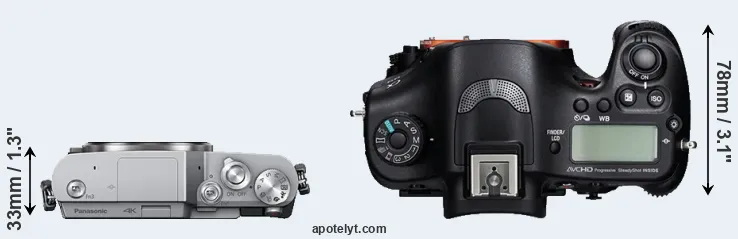 An illustration of the physical size and weight of the Panasonic GX800 and the Sony A99 is provided in the side-by-side display below. The two cameras are presented according to their relative size. Three consecutive views from the front, the top, and the rear side are shown. All width, height and depth measures are rounded to the nearest millimeter.