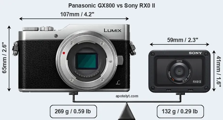 The side-by-side display below illustrates the physical size and weight of the Panasonic GX800 and the Sony RX0 II. The two cameras are presented according to their relative size. Three consecutive views from the front, the top, and the rear side are shown. All width, height and depth measures are rounded to the nearest millimeter.