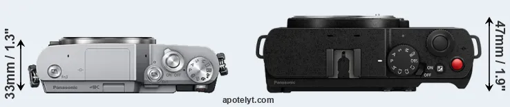 The physical size and weight of the Panasonic GX850 and the Panasonic S9 are illustrated in the side-by-side display below. The two cameras are presented according to their relative size. Three consecutive perspectives from the front, the top, and the back are available. All width, height and depth dimensions are rounded to the nearest millimeter.
