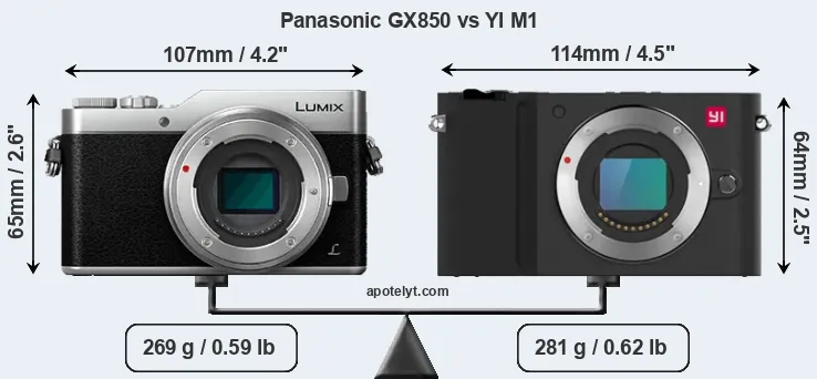 The physical size and weight of the Panasonic GX850 and the YI M1 are illustrated in the side-by-side display below. The two cameras are presented according to their relative size. Three successive views from the front, the top, and the rear are shown. All width, height and depth measures are rounded to the nearest millimeter.