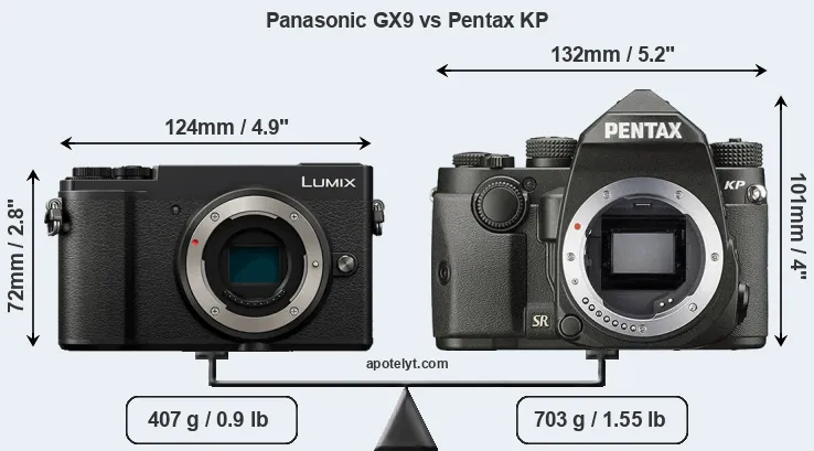 If the front view area (width x height) of the cameras is taken as an aggregate measure of their size, the Pentax KP is considerably larger (49 percent) than the Panasonic GX9. Moreover, the KP is substantially heavier (73 percent) than the GX9. It is noteworthy in this context that the KP is splash and dust-proof, while the GX9 does not feature any corresponding weather-sealing.