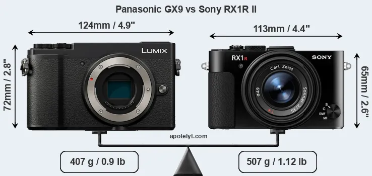 The side-by-side display below illustrates the physical size and weight of the Panasonic GX9 and the Sony RX1R II. The two cameras are presented according to their relative size. Three consecutive perspectives from the front, the top, and the back are available. All width, height and depth measures are rounded to the nearest millimeter.