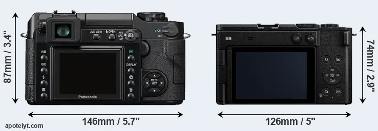 The physical size and weight of the Panasonic L1 and the Panasonic S9 are illustrated in the side-by-side display below. The two cameras are presented according to their relative size. Three successive views from the front, the top, and the rear are shown. All width, height and depth measures are rounded to the nearest millimeter.