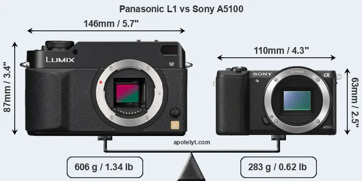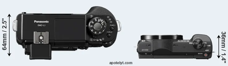 The side-by-side display below illustrates the physical size and weight of the Panasonic L1 and the Sony A5100. The two cameras are presented according to their relative size. Three consecutive perspectives from the front, the top, and the back are available. All width, height and depth measures are rounded to the nearest millimeter.