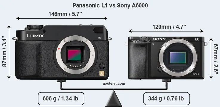 If the front view area (width x height) of the cameras is taken as an aggregate measure of their size, the Sony A6000 is considerably smaller (37 percent) than the Panasonic L1. Moreover, the A6000 is substantially lighter (43 percent) than the L1. In this context, it is worth noting that neither the L1 nor the A6000 are weather-sealed.