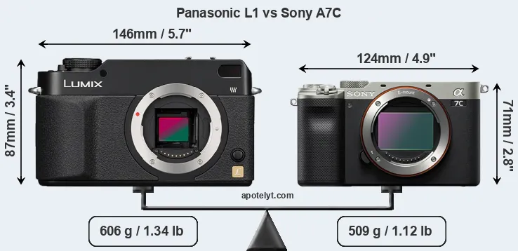 An illustration of the physical size and weight of the Panasonic L1 and the Sony A7C is provided in the side-by-side display below. The two cameras are presented according to their relative size. Three consecutive perspectives from the front, the top, and the back are available. All width, height and depth dimensions are rounded to the nearest millimeter.