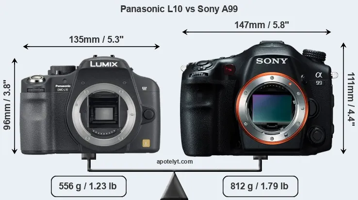 The side-by-side display below illustrates the physical size and weight of the Panasonic L10 and the Sony A99. The two cameras are presented according to their relative size. Three consecutive perspectives from the front, the top, and the back are available. All width, height and depth measures are rounded to the nearest millimeter.
