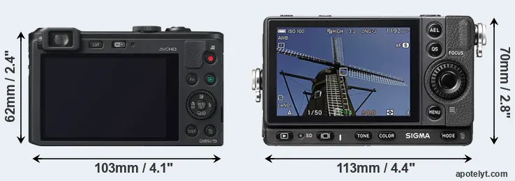 The Panasonic Lumix DMC-LF1 and the Sigma fp are two digital cameras that were officially introduced, respectively, in April 2013 and July 2019. The LF1 is a fixed lens compact, while the fp is a mirrorless interchangeable lens camera. The cameras are based on a 1/1.7-inch (LF1) and a full frame (fp) sensor. The Panasonic has a resolution of 12 megapixels, whereas the Sigma provides 24 MP.