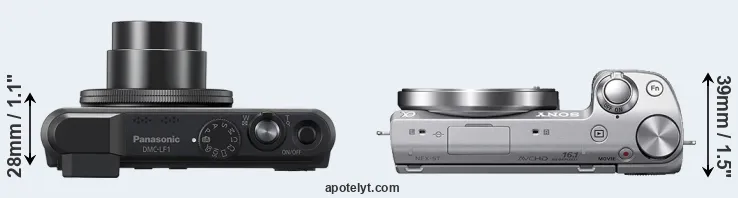 The side-by-side display below illustrates the physical size and weight of the Panasonic LF1 and the Sony NEX-5T. The two cameras are presented according to their relative size. Three consecutive views from the front, the top, and the rear side are shown. All width, height and depth dimensions are rounded to the nearest millimeter.