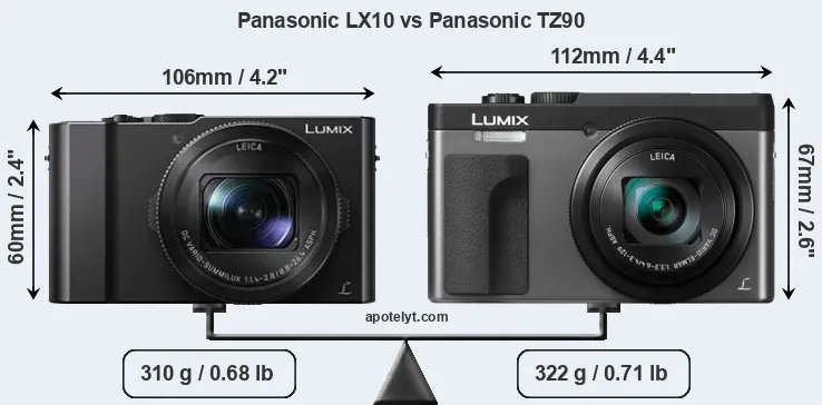 The side-by-side display below illustrates the physical size and weight of the Panasonic LX10 and the Panasonic TZ90. The two cameras are presented according to their relative size. Three consecutive perspectives from the front, the top, and the back are available. All width, height and depth measures are rounded to the nearest millimeter.