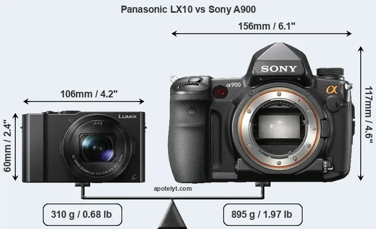 If the front view area (width x height) of the cameras is taken as an aggregate measure of their size, the Sony A900 is considerably larger (187 percent) than the Panasonic LX10. It is noteworthy in this context that the A900 is splash and dust-proof, while the LX10 does not feature any corresponding weather-sealing.