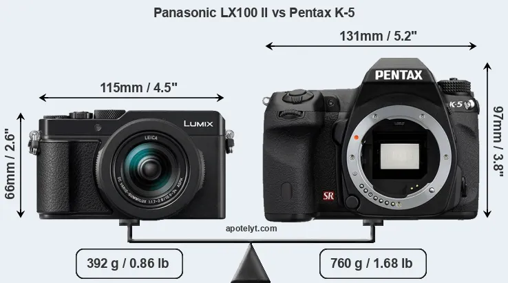 If the front view area (width x height) of the cameras is taken as an aggregate measure of their size, the Pentax K-5 is considerably larger (67 percent) than the Panasonic LX100 II. It is noteworthy in this context that the K-5 is splash and dust-proof, while the LX100 II does not feature any corresponding weather-sealing.