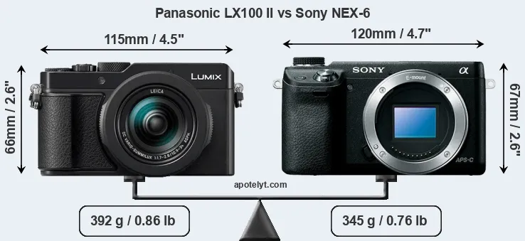 An illustration of the physical size and weight of the Panasonic LX100 II and the Sony NEX-6 is provided in the side-by-side display below. The two cameras are presented according to their relative size. Three consecutive perspectives from the front, the top, and the back are available. All size dimensions are rounded to the nearest millimeter.
