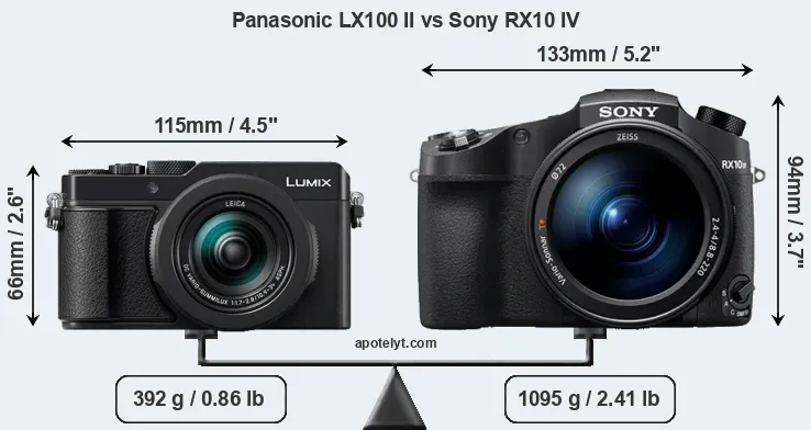 If the front view area (width x height) of the cameras is taken as an aggregate measure of their size, the Sony RX10 IV is considerably larger (65 percent) than the Panasonic LX100 II. Moreover, the RX10 IV is substantially heavier (179 percent) than the LX100 II. It is noteworthy in this context that the RX10 IV is splash and dust-proof, while the LX100 II does not feature any corresponding weather-sealing.