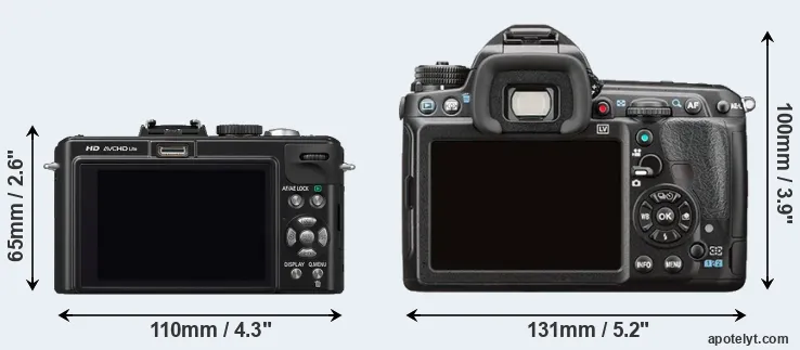 The side-by-side display below illustrates the physical size and weight of the Panasonic LX5 and the Pentax K-3 II. The two cameras are presented according to their relative size. Three successive views from the front, the top, and the rear are shown. All width, height and depth dimensions are rounded to the nearest millimeter.