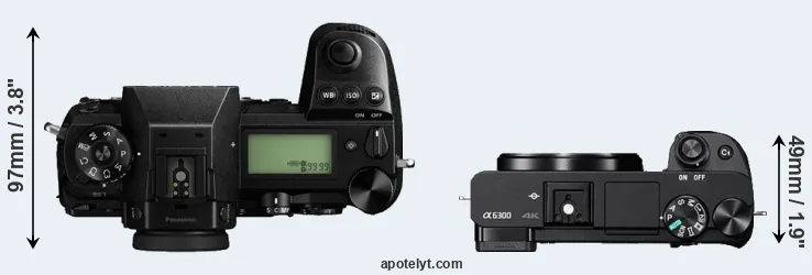 An illustration of the physical size and weight of the Panasonic S1 and the Sony A6300 is provided in the side-by-side display below. The two cameras are presented according to their relative size. Three consecutive views from the front, the top, and the rear side are shown. All width, height and depth measures are rounded to the nearest millimeter.