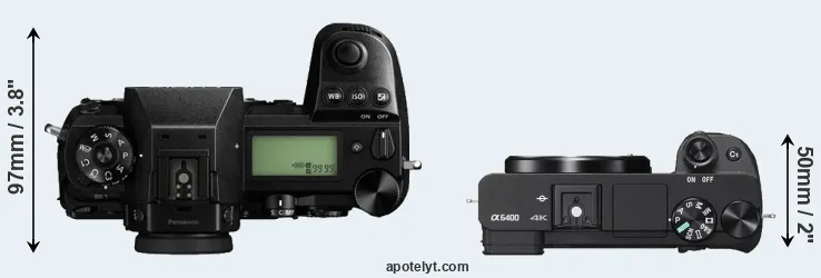 An illustration of the physical size and weight of the Panasonic S1 and the Sony A6400 is provided in the side-by-side display below. The two cameras are presented according to their relative size. Three consecutive views from the front, the top, and the rear side are shown. All width, height and depth measures are rounded to the nearest millimeter.