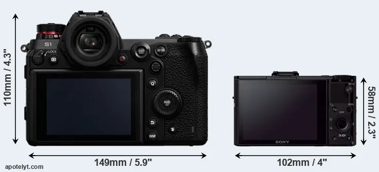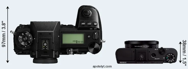 The physical size and weight of the Panasonic S1 and the Sony RX100 II are illustrated in the side-by-side display below. The two cameras are presented according to their relative size. Three consecutive views from the front, the top, and the rear side are shown. All width, height and depth measures are rounded to the nearest millimeter.
